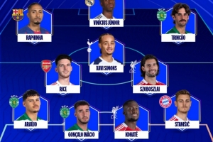 體育資訊3月20日訊 歐冠1/8決賽次回合結束了全部的爭奪,歐足聯官方評選出了周最佳陣,拉菲尼亞、維尼修斯、賴斯以及索博斯洛伊入選。