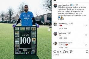 桑切斯社媒曬出與百場里程碑紀念品的合照,配文:“100場比賽!達成這一里程碑的感覺真特別,感謝一路上給予幫助和支持的每個人,喜歡與這群隊友并肩作戰的感覺,我已準備好迎來更多比賽?!?/p>
