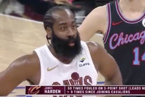 騎士VS公牛,哈登首節兩次打成3+1,轉播方曬統計:哈登本賽季50次造成三分球犯規領跑全聯盟,加入騎士之后已經9次。