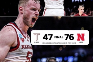 這是內(nèi)布拉斯加大學在NCAA瘋三的首勝,此前他們八次首輪出局。