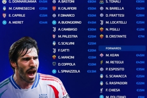 后衛(wèi):巴斯托尼(8000萬(wàn)歐)、卡拉菲奧里(5000萬(wàn)歐)、迪馬爾科(5000萬(wàn)歐)、布翁喬爾諾(4500萬(wàn)歐)、坎比亞索(3000萬(wàn)歐)、斯卡爾維尼(2500萬(wàn)歐)、帕萊斯特拉(2500萬(wàn)歐)、加蒂(2000萬(wàn)歐)、曼奇尼(1500萬(wàn)歐)、迭戈·庫(kù)博拉(1000萬(wàn)歐)、斯皮納佐拉(350萬(wàn)歐)