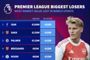 體育資訊03月09日訊 德轉今日更新英超身價。在英超跌幅榜上,伊薩克暴跌2000萬歐居榜首,薩卡、厄德高等8人跌1000萬歐。