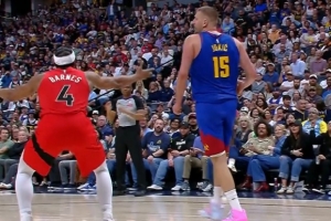 GIF-約基奇搶到前場籃板造成巴恩斯犯規