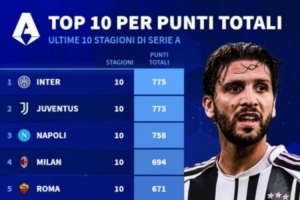 體育資訊3月21日訊 德國(guó)轉(zhuǎn)會(huì)市場(chǎng)統(tǒng)計(jì)了過(guò)去10個(gè)賽季各隊(duì)在意甲的總積分,并列出榜單,國(guó)米775分居首,尤文773分次席。