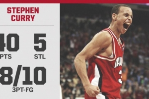 本場比賽,當時效力于戴維森學院的庫里出戰39分鐘,22投14中,三分球10中8、罰球6中4,砍下40分3籃板2助攻5搶斷,其中下半場則是貢獻30分。