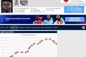 薩卡一年前還是生涯最高的1.5億歐身價,隨后接連下跌到1.4億、1.3億,以及最新的1.2億。