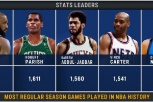 歷史出場數排名:詹姆斯1612場、帕里什1611場、賈巴爾1560場、卡特1541場、諾維茨基1522場