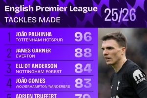 體育資訊3月9日訊 Squawka統(tǒng)計(jì)本賽季球員在英超的成功搶斷次數(shù),并列出榜單,帕利尼亞96次居首。