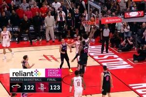 比賽最后時刻,火箭一度出現險情,領先1分火箭底線球失誤,籃下干擾球熱火直接反超。