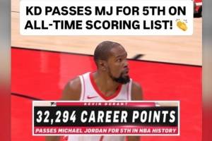 在本場比賽中,杜蘭特生涯總得分32294分,超越喬丹,上升至歷史第五。