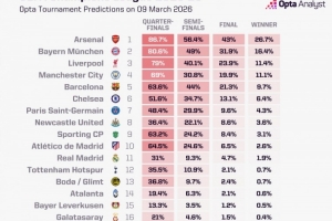 體育資訊3月10日訊 歐冠1/8決賽即將開戰,Opta超級計算機預測了各隊晉級8強的概率,并列出榜單。
