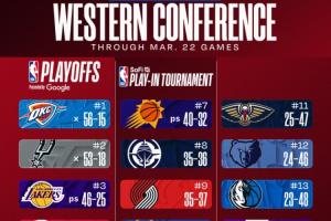 2.西部第五的掘金、第六的森林狼以及第七的太陽今日相繼贏球,其中掘金與森林狼的戰績繼續持平(同為44勝28負,掘金因交手戰績占優排名靠前)。