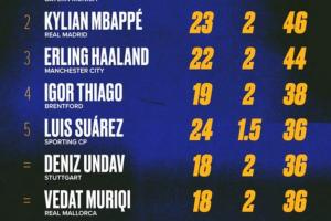 5、路易斯·蘇亞雷斯(葡萄牙體育,24球,系數(shù)1.5):36分