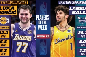 體育資訊3月24日訊 今日NBA官方宣布,湖人球星東契奇和黃蜂球星拉梅洛·鮑爾分別被評為本賽季第22周西部和東部聯盟周最佳球員。