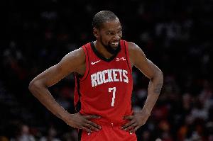 上半場比賽中,火箭外線手感十分糟糕,直到第二節還剩三分40秒才由杜蘭特命中第一記三分。