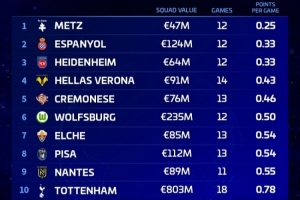 體育資訊3月24日訊 德國轉會市場統計了2026年五大聯賽球隊場均積分最低的Top10,法甲的梅斯0.25分最少。
