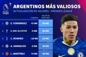 體育資訊3月10日訊 德國轉會市場更新了英超球員的身價,并列出英超阿根廷球員德轉身價排名,恩佐9000萬歐居首。