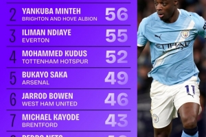 體育資訊3月24日訊 數據機構Squawka統計出了本賽季英超球員過人數情況,曼城邊鋒多庫以63次居首。