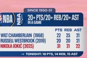 2025年約基奇曾轟下31分21籃板22助攻,本場目前約基奇已砍下18分14籃板15助攻)