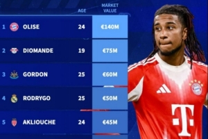 1、 奧利塞(拜仁)24歲 1.4億歐