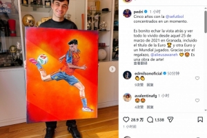 佩德里獲贈(zèng)一幅畫作,內(nèi)容為他身穿西班牙國(guó)家隊(duì)球衣的形象,佩德里社媒曬出這幅畫作,配文:“西班牙國(guó)家隊(duì)的五年時(shí)光,所有回憶凝聚于此刻。回首往事是多么美好,自2021年3月25日在格拉納達(dá)的那個(gè)日子以來(lái),我們經(jīng)歷了太多,包括一座歐洲杯冠軍,以及另外一次歐洲杯和世界杯的征程。感謝這份厚禮,這簡(jiǎn)直是一件藝術(shù)品!”