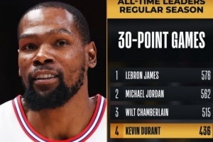 據(jù)統(tǒng)計,這是杜蘭特生涯第436場單場30+,超越卡爾·馬龍,上升至NBA歷史第四位,僅次于詹姆斯、喬丹和張伯倫。