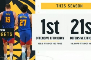 據統計,本賽季至今,掘金百回合進攻效率為120.5,排名聯盟第一;