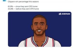 美媒曬出數據,快船送走保羅前勝率23.8%,送走保羅之后的勝率為61.9%。