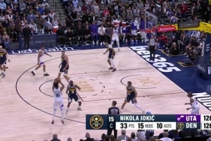 比賽進行到關鍵時刻,掘金球星約基奇助攻卡梅隆·約翰遜命中底角三分球終于追平比分,同時自己的數(shù)據(jù)來到33分15籃板10助攻的三雙。