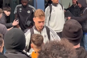 基米希在德國4-3加比瑞士的比賽中被肘擊受傷,今天以基米希為首的球員們仍抽出大量時間為球迷簽名合影,基米希在頭部裂傷后上唇貼著一塊厚創可貼。