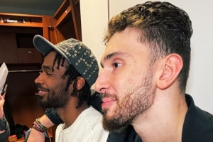 火箭美女記者Vanessa Richardson曬出申京和伊森賽后接受采訪時摟著肩膀的合照,配文寫道:“氛圍,化學反應,肢體語言。”