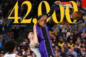 此役,湖人球星詹姆斯通過扣籃拿下生涯常規(guī)賽第42000分!