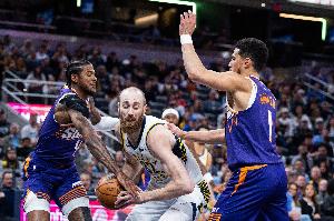 上半場(chǎng)比賽,太陽(yáng)進(jìn)攻端主要靠布克和杰倫·格林撐起,二人里突外投都效率在線。布克12中10,三分3中3砍下23分2籃板4助攻;格林12中8,三分5中3砍下19分4籃板1助攻1搶斷。