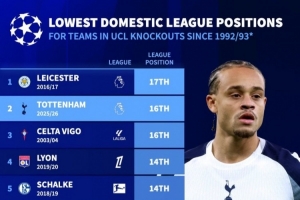 歐冠淘汰賽球隊(duì)聯(lián)賽排名最低榜: