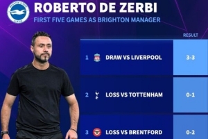 德澤爾比自2022年9月起擔任布萊頓主帥,上任后的前五場英超比賽,布萊頓戰平了利物浦與諾丁漢森林,輸給熱刺、布倫特福德、曼城。