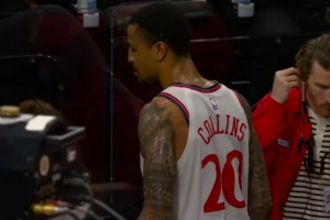 科林斯搶籃板和大洛撞到一起 膝蓋有點受傷回更衣室了