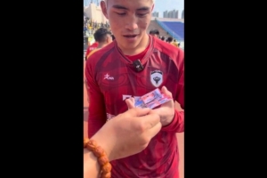 體育資訊4月1日訊 4月1日,2026泰山好水CMG群眾足球邀請賽小組最后一個比賽日,山東泰安隊2-2戰(zhàn)平青海玉樹隊,記者牛志明賽后向玉樹隊門將索南龍周贈送王大雷簽名照。