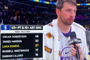 據統計,這是東契奇生涯第27次至少40分10助攻,歷史第三多,僅次于大O(46次)和哈登(32次)。