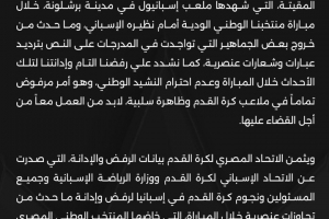 此役西班牙球迷在場上呼喊種族歧視口號,對此埃及足協(xié)發(fā)布聲明:“埃及足球協(xié)會強烈譴責在巴塞羅那西班牙人球場進行的埃及國家隊與西班牙國家隊友誼賽中發(fā)生的令人發(fā)指的種族主義事件,部分現(xiàn)場觀眾高喊種族主義口號,這種行為我們予以完全拒絕和嚴厲譴責。此外,對于比賽中出現(xiàn)的不尊重埃及國歌的行為,我們同樣表示堅決反對,此類行為在足球場上是絕對不可接受的,是一種必須攜手根除的負面現(xiàn)象。