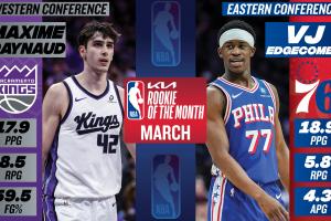體育資訊04月03日訊 今天NBA官方公布了3月份月最佳新秀,西部國王42號秀雷諾和東部76人探花秀埃奇庫姆當選。
