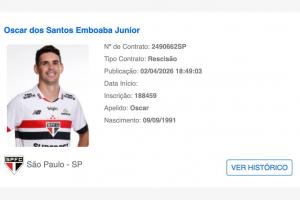 體育資訊04月04日訊 巴西足協(xié)官網(wǎng)的球員注冊系統(tǒng)中顯示,34歲奧斯卡與圣保羅已于當?shù)貢r間4月2日解除合同!