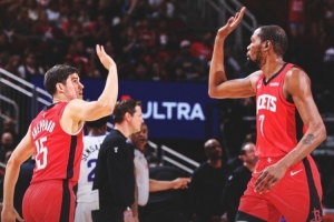 賽后火箭官方曬出本場(chǎng)贏球海報(bào),杜蘭特和謝潑德登上封面。