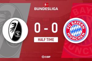 上半場(chǎng)傷停補(bǔ)時(shí)3分鐘,半場(chǎng)結(jié)束,拜仁暫0-0弗賴堡。