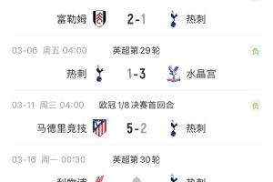 熱刺歐冠1/8決賽首回合2-5慘敗馬競(jìng),下周一周內(nèi)將連續(xù)對(duì)陣?yán)锲帧ⅠR競(jìng)(次回合)、森林。