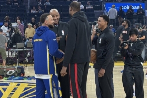 賽前,火箭球星杜蘭特和勇士核心庫里來到場地中央,進行一波交流。