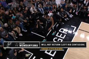 下半場(chǎng)開始時(shí)馬刺官方宣布文班左肋骨挫傷,下半場(chǎng)提前退賽。