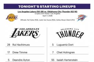 體育資訊04月08日訊 今日10:30,湖人將在主場再戰雷霆。