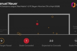 歐冠淘汰賽客戰(zhàn)皇馬做出9次撲救,諾伊爾是有統(tǒng)計以來門將首人