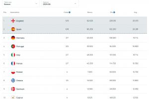 本賽季各聯賽歐戰積分排名: