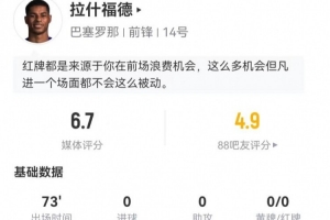 體育資訊4月9日訊 巴薩在本輪歐冠0-2落后馬競,拉什福德本場數據如下: